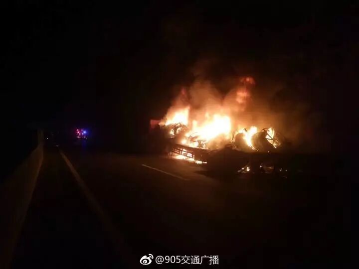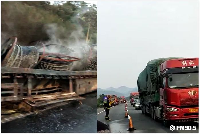 据905前方消息,此次起火的是一辆装载电缆的半挂车,目前火已经扑灭,正在等待起吊。